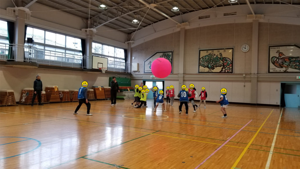 キンボールスポーツはカナダで生まれたバレーボールに似た室内で行うNEWスポーツです。3チームが同時にコートに入り、122㎝の大きなボールを打ち合って落とさないように拾い合い点数を争います。本来は1チーム4名制で行いますが、今回は低学年の子どもたちも参加しているので1チーム5名制で行いました。