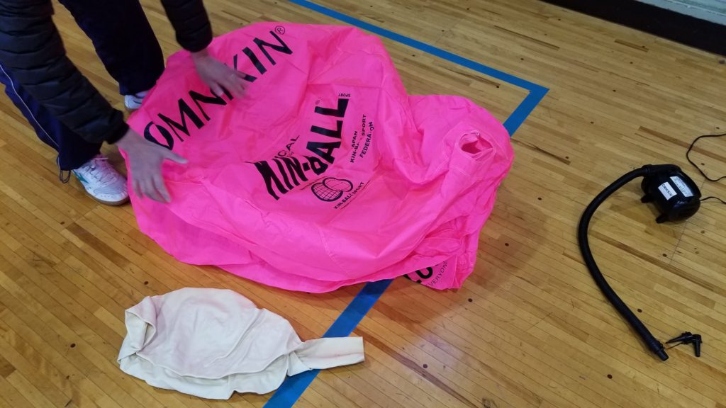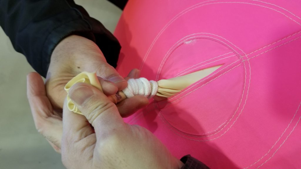 ボールは外側のピンク色のカバーと中の白いゴム風船の2重構造となっています。中のゴム風船にコンプレッサーで空気を入れて膨らませます。風船の口をねじって紐で縛ります。