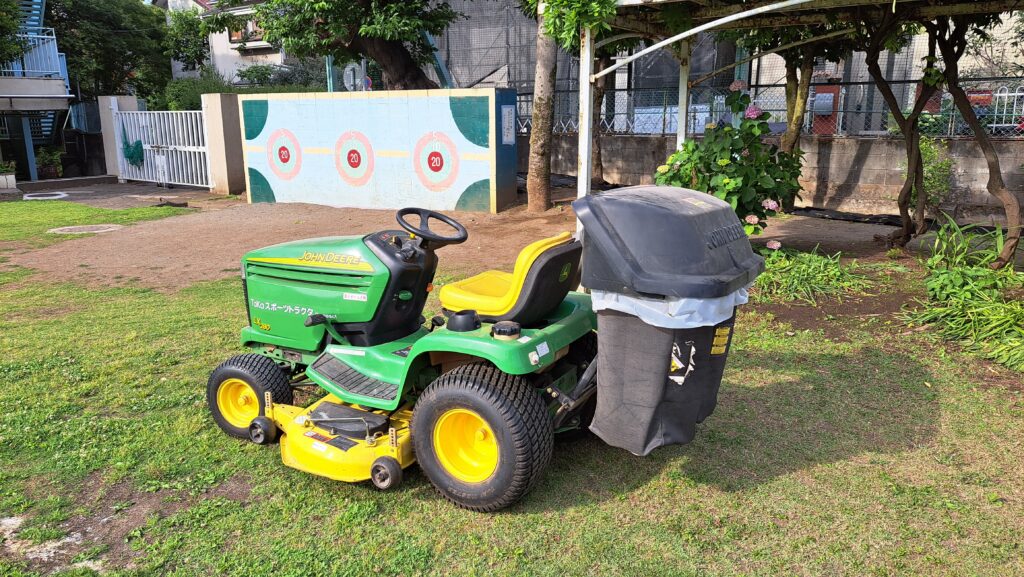 15年程前に購入した乗用芝刈機 その名も ジョンディア芝刈機 LX280!先日、メインベルトが切れてしまい故障中でした。15年間代えて無かったので仕方ないですね。新規オヤジの力も借りて学校と相談し5月27日(土)に交換して頂きました!